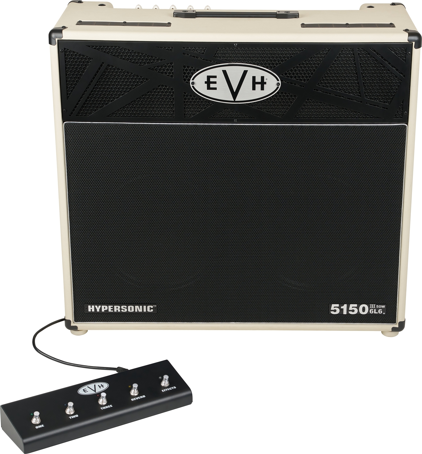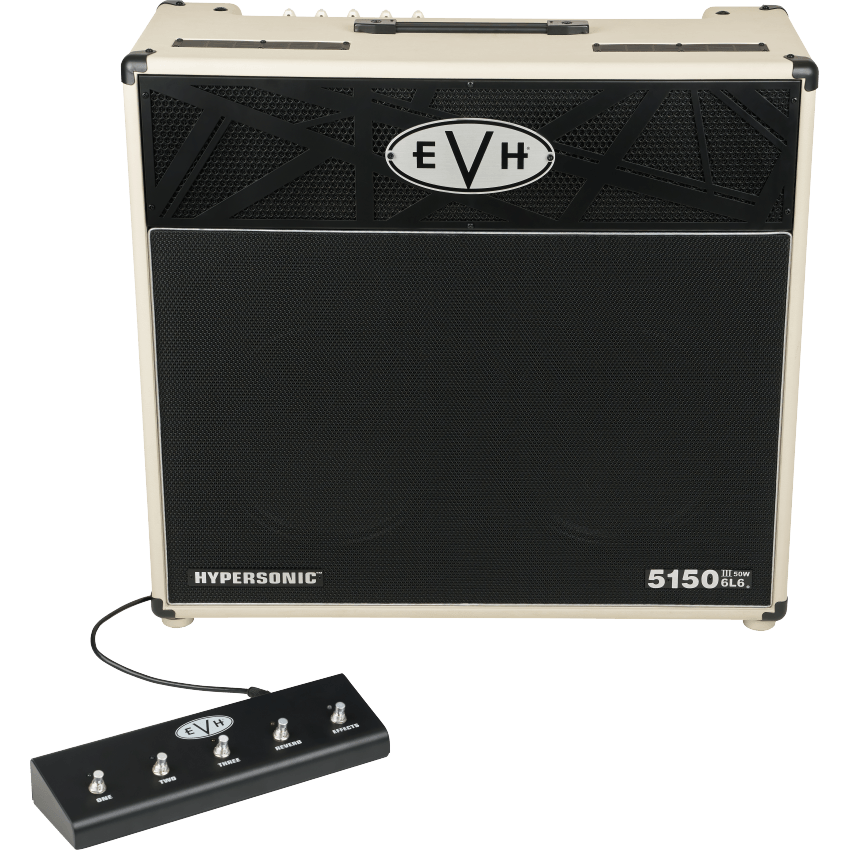 These changes make the 5150III Hypersonic combo weigh substantially less than the all-tube version. Added concentric EQ controls for channels one and two, and independent noise gate controls for each channel, enhance the user experience. The included footswitch has also been updated to allow both reverb and effects loop selection. Other features include a power selector for full power and five attenuated settings, balanced XLR line output with impulse response (IR) cabinet simulations, and a mute switch for silent stage or recording use. The EVH 5150III Hypersonic amps are available in black or ivory vinyl covering.